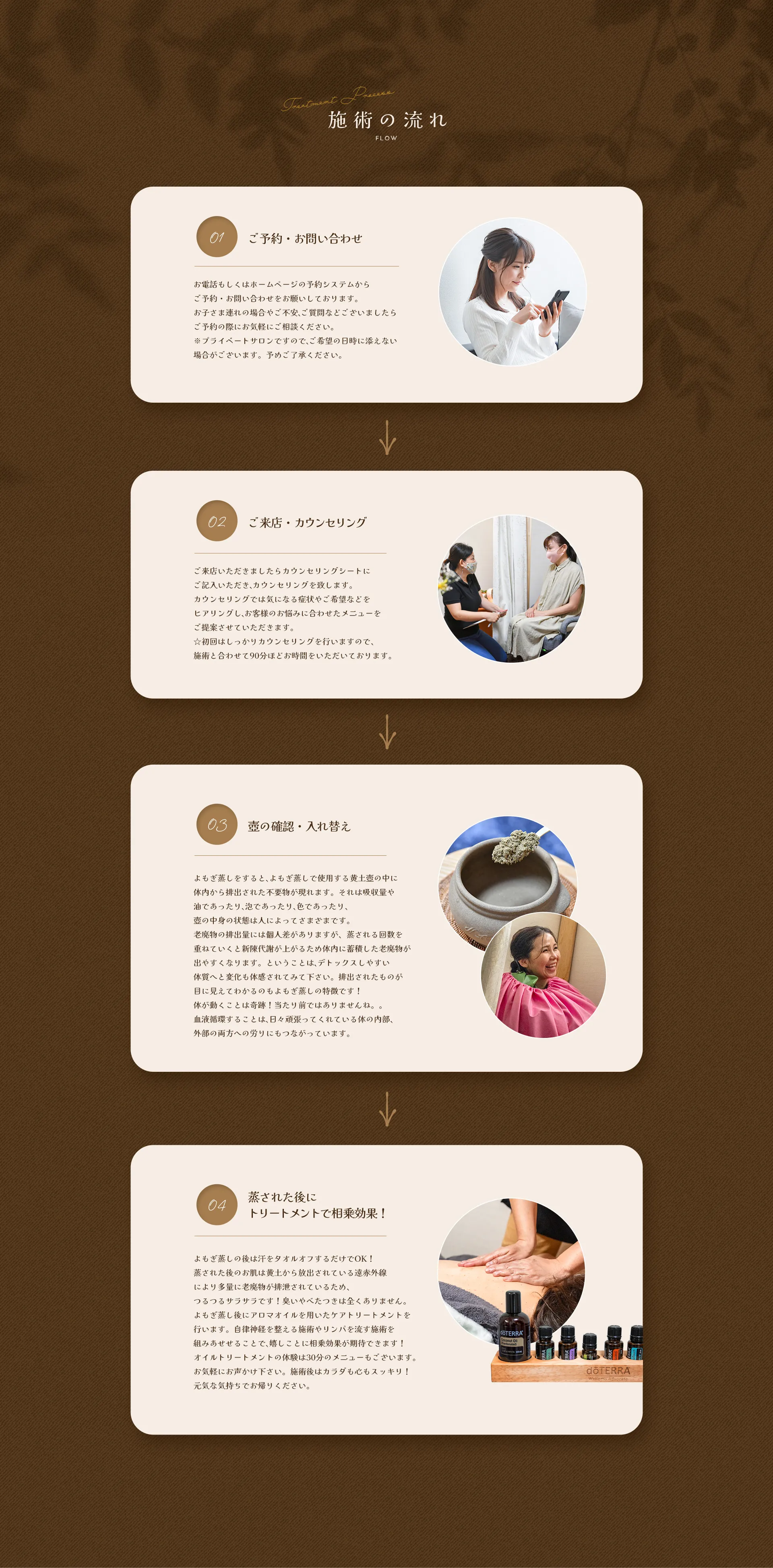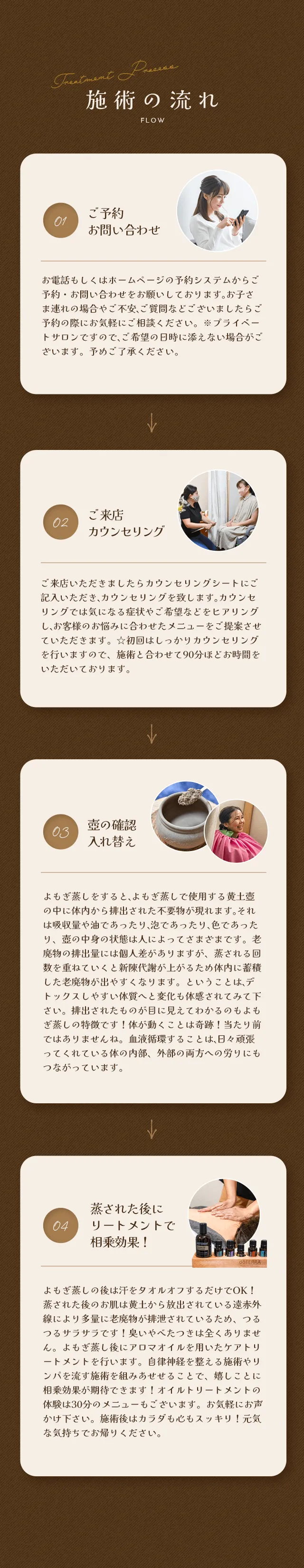 トリートメント施術前に温活としてよもぎ蒸しをで血液循環が良くなると、オイルが“より“身体の深部まで浸透し、オイルの力も”更に”パワフルに働くことができるので相乗効果が期待できます。よもぎ蒸しは体中の皮膚粘膜から薬草成分を吸収し、体内の老廃物を汗と一緒に排出してカラダをデトックスする韓国の伝統的な民間療法です。カラダの中の臓器まで温まりますし、臓器からも老廃物を排出するので新陳代謝促進や免疫力アップ、体質の改善が疲労回復につながります。継続は力!という言葉があるように、